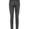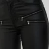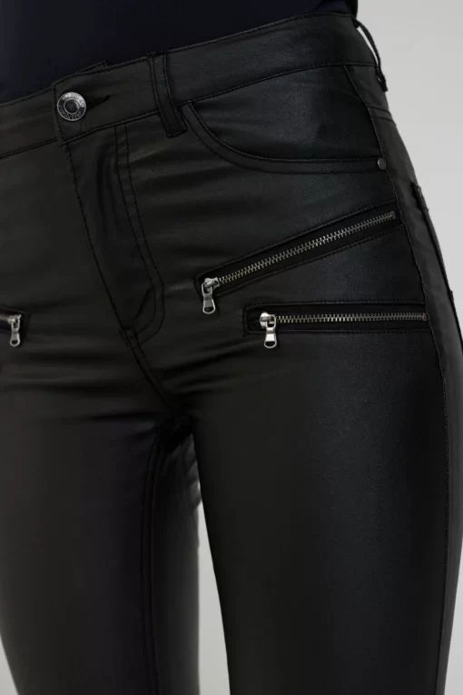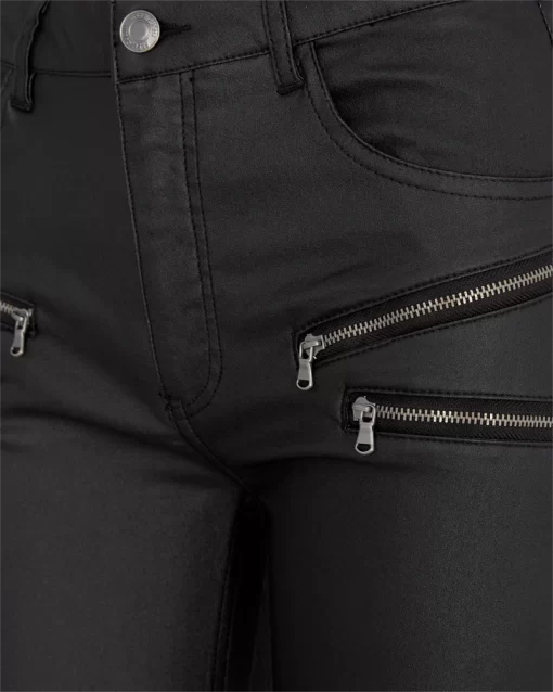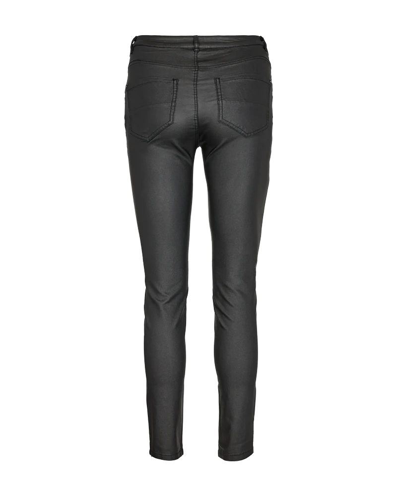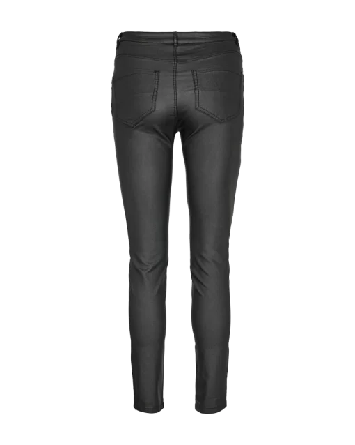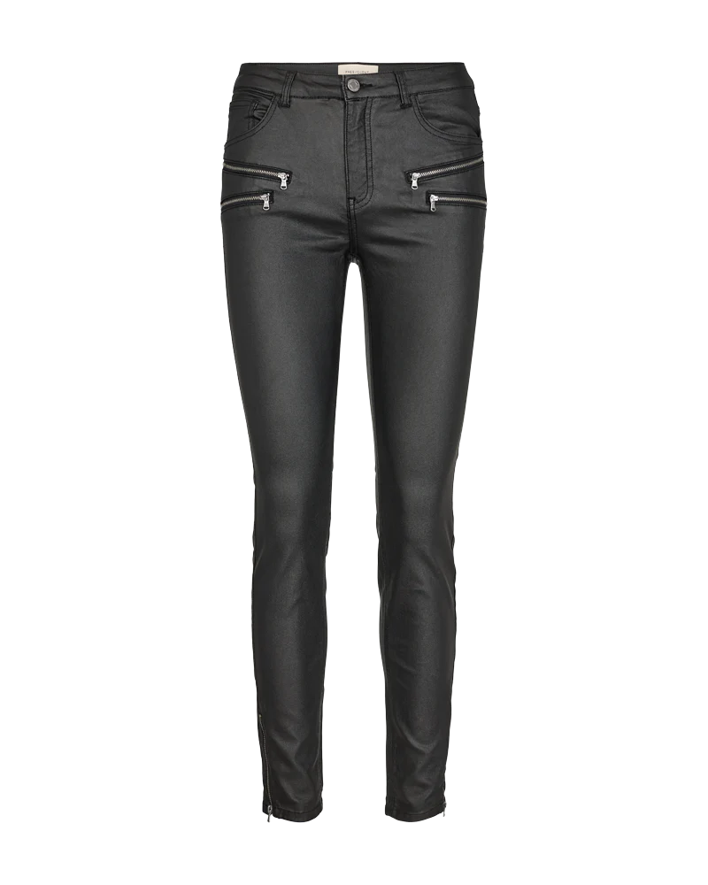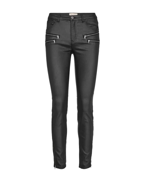 Jeans fra Freequent i en smuk, coatet kvalitet. Bukserne er et par klassiske '5 Pocket Model' med lynlåsdetaljer på fronten, en høj talje, 7/8-længde, en tætsiddende pasform samt knap- og lynlåslukning på fronten. Modellen bruger størrelse S og er 177 cm høj.