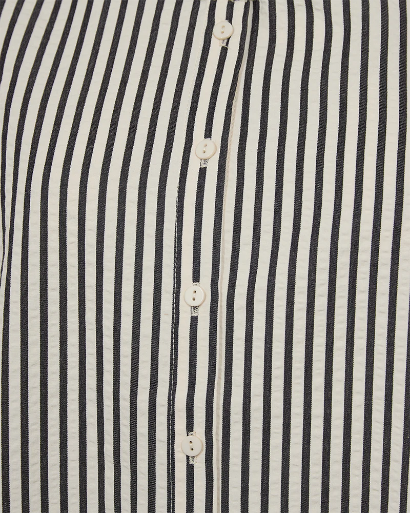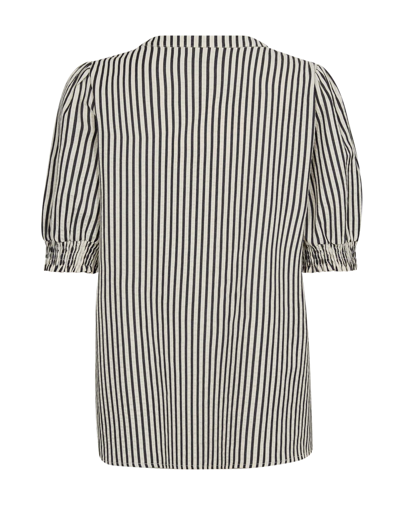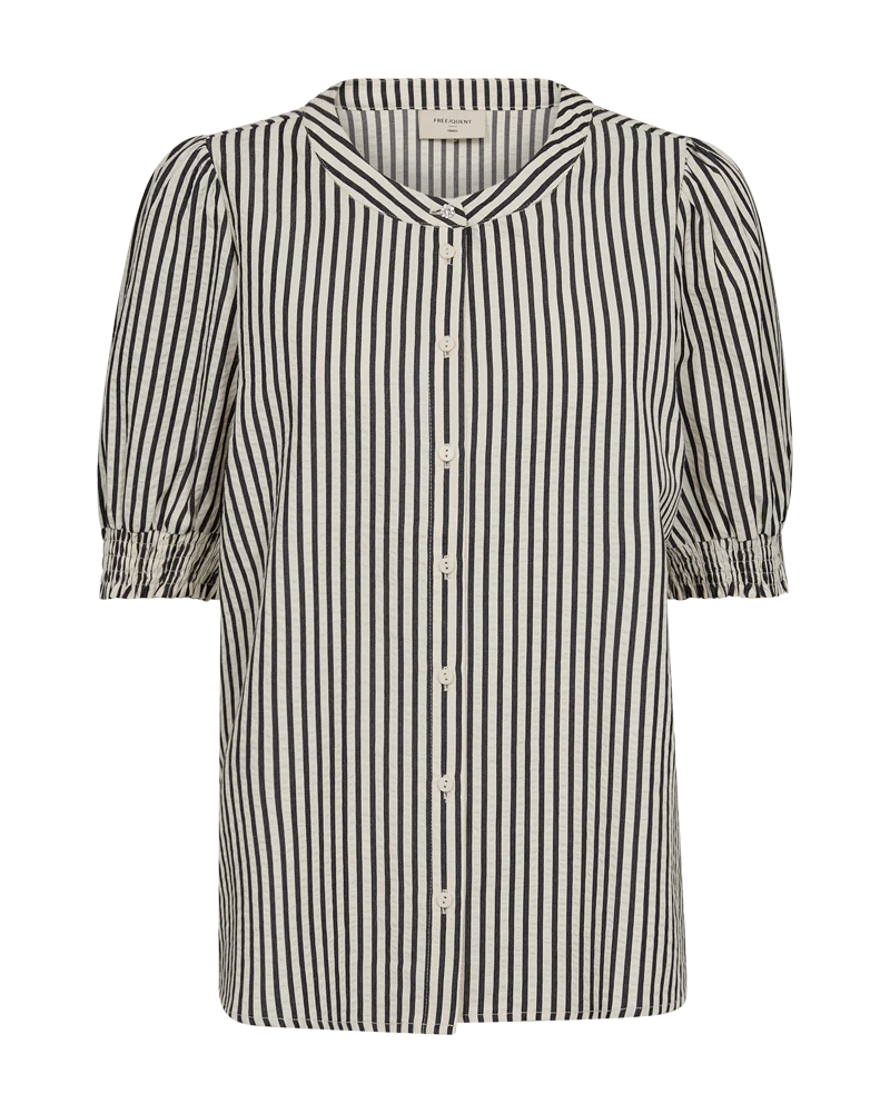 Skjorte fra Freequent i en let kvalitet med et stribet print. Skjorten har korte pufærmer med smock cuff, en rund halsudskæring, knaplukning med en fin knap i toppen samt en elegant, løs pasform. Korte pufærmer Rund halsudskæring Knaplukning Løs pasform Stribet
