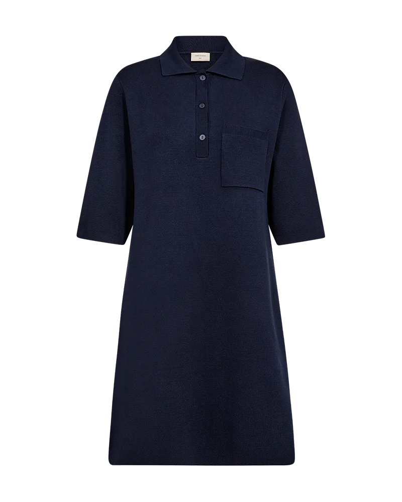 Kjole fra Freequent i en blød, finstrikket kvalitet. Kjolen har halvlange ærmer, krave med knaplukning på brystet, en enkelt brystlomme samt en let A-facon i skørtet. Halvlange ærmer Krave og knaplukning på brystet Brystlomme A-facon i skørtet Finstrikket