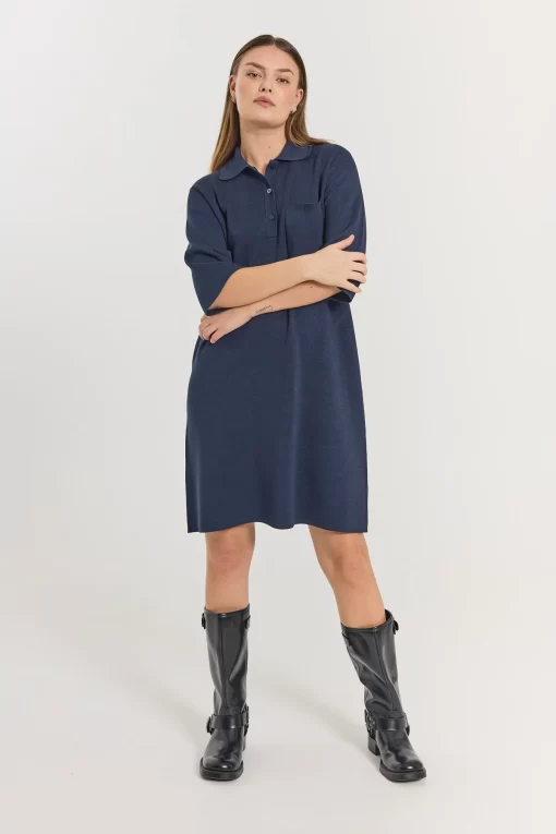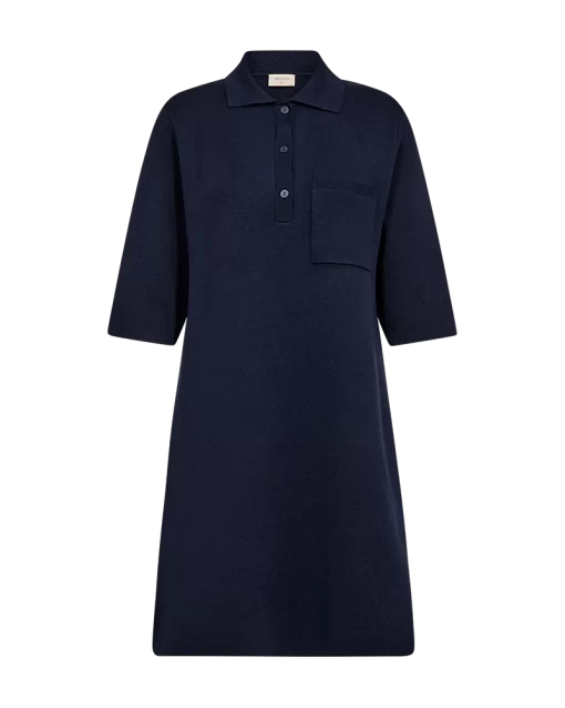 Kjole fra Freequent i en blød, finstrikket kvalitet. Kjolen har halvlange ærmer, krave med knaplukning på brystet, en enkelt brystlomme samt en let A-facon i skørtet. Halvlange ærmer Krave og knaplukning på brystet Brystlomme A-facon i skørtet Finstrikket