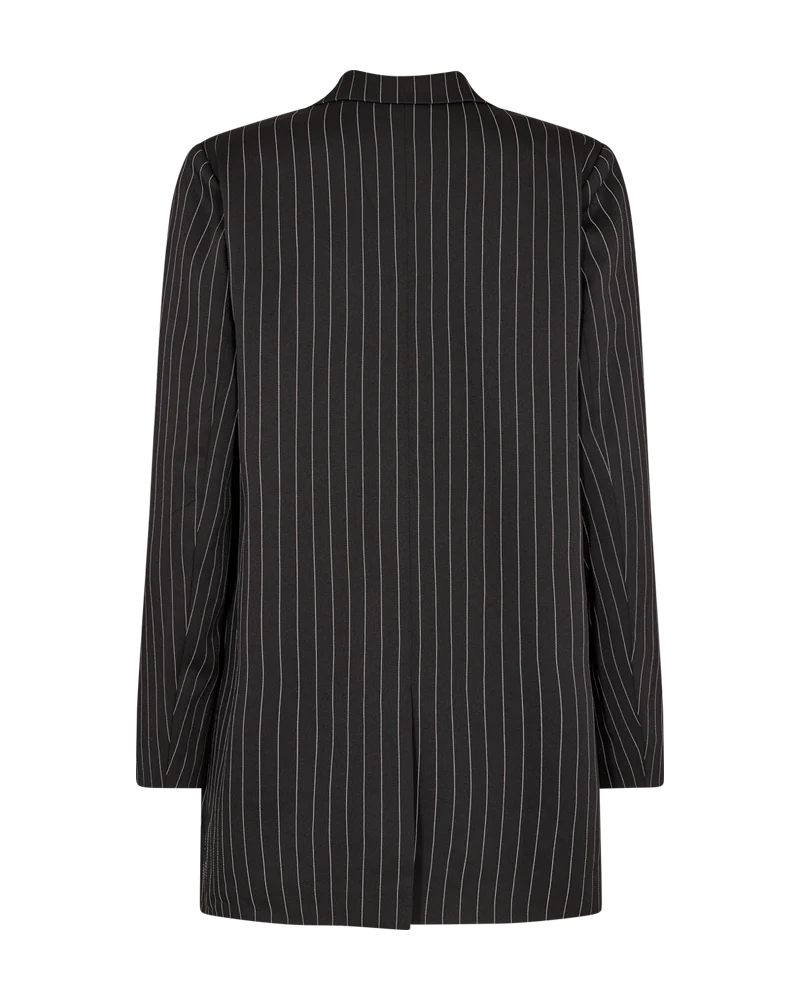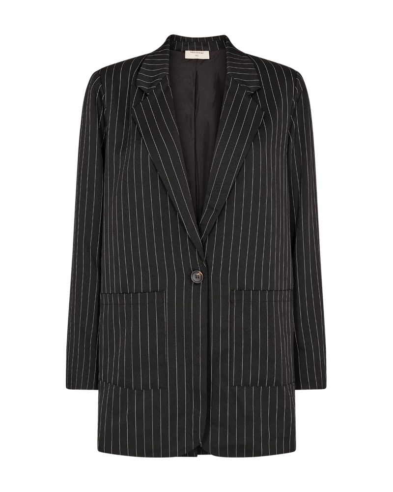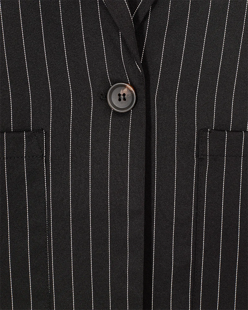 Jakke i en lækker kvalitet med striber. Jakken er enkel i modellen med lange ærmer, et bredt revers, én enkel knaplukning på fronten, frontlommer samt en slids bagpå, der giver jakken et elegant udtryk. Striber Bredt revers Lange ærmer Bredt revers Én enkel knaplukning på fronten Frontlommer Slids bagpå