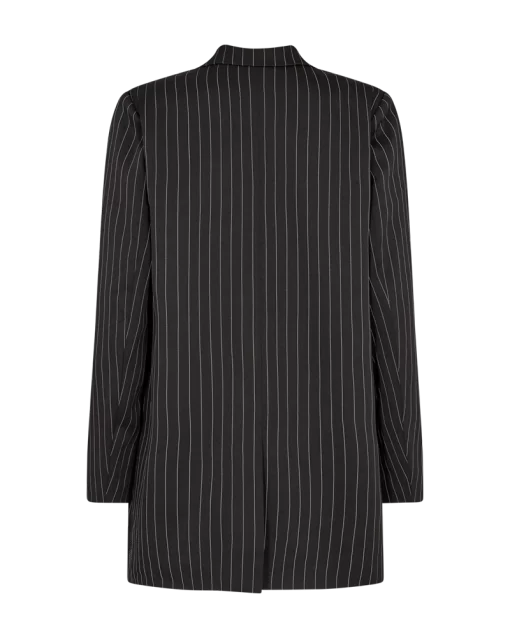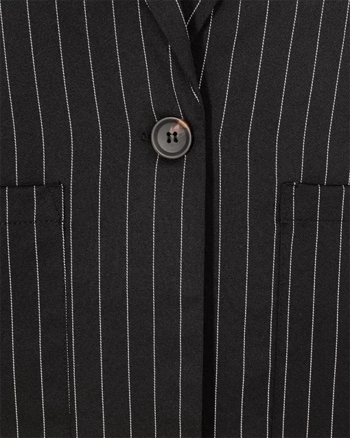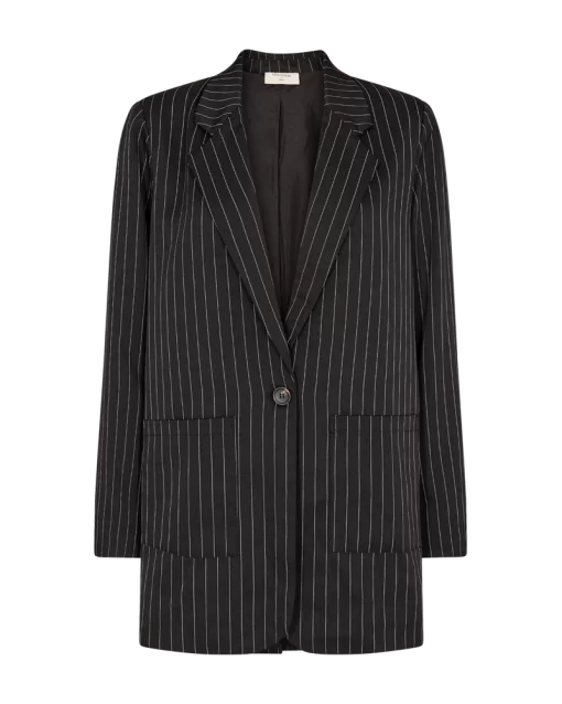 Jakke i en lækker kvalitet med striber. Jakken er enkel i modellen med lange ærmer, et bredt revers, én enkel knaplukning på fronten, frontlommer samt en slids bagpå, der giver jakken et elegant udtryk. Striber Bredt revers Lange ærmer Bredt revers Én enkel knaplukning på fronten Frontlommer Slids bagpå