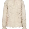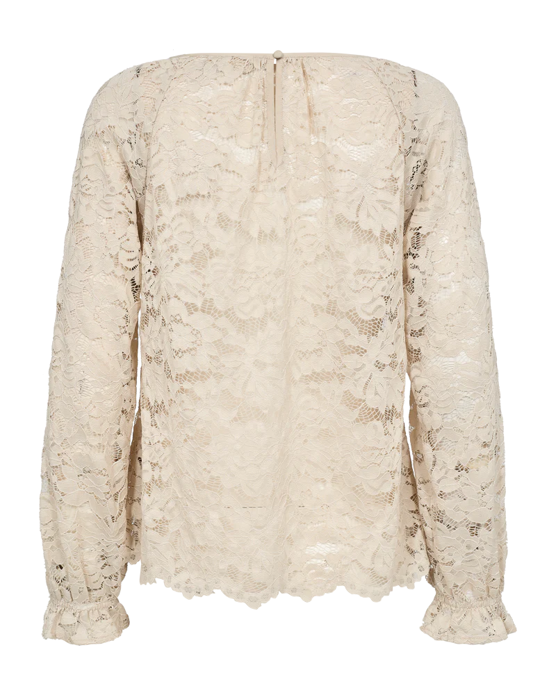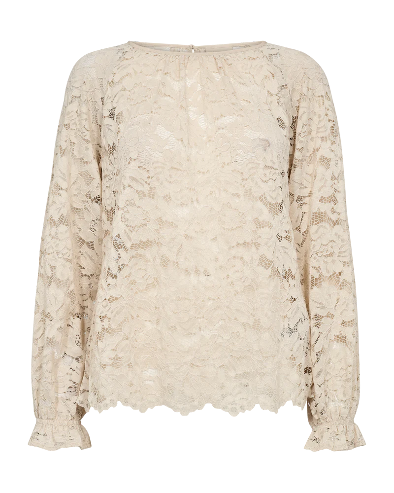 Bluse fra Freequent i en fin blondekvalitet med et blomstret mønster. Blusen er enkel i modellen med lange ballonærmer, en rund halsudskæring, en slids med knaplukning i nakken samt en løs pasform.
