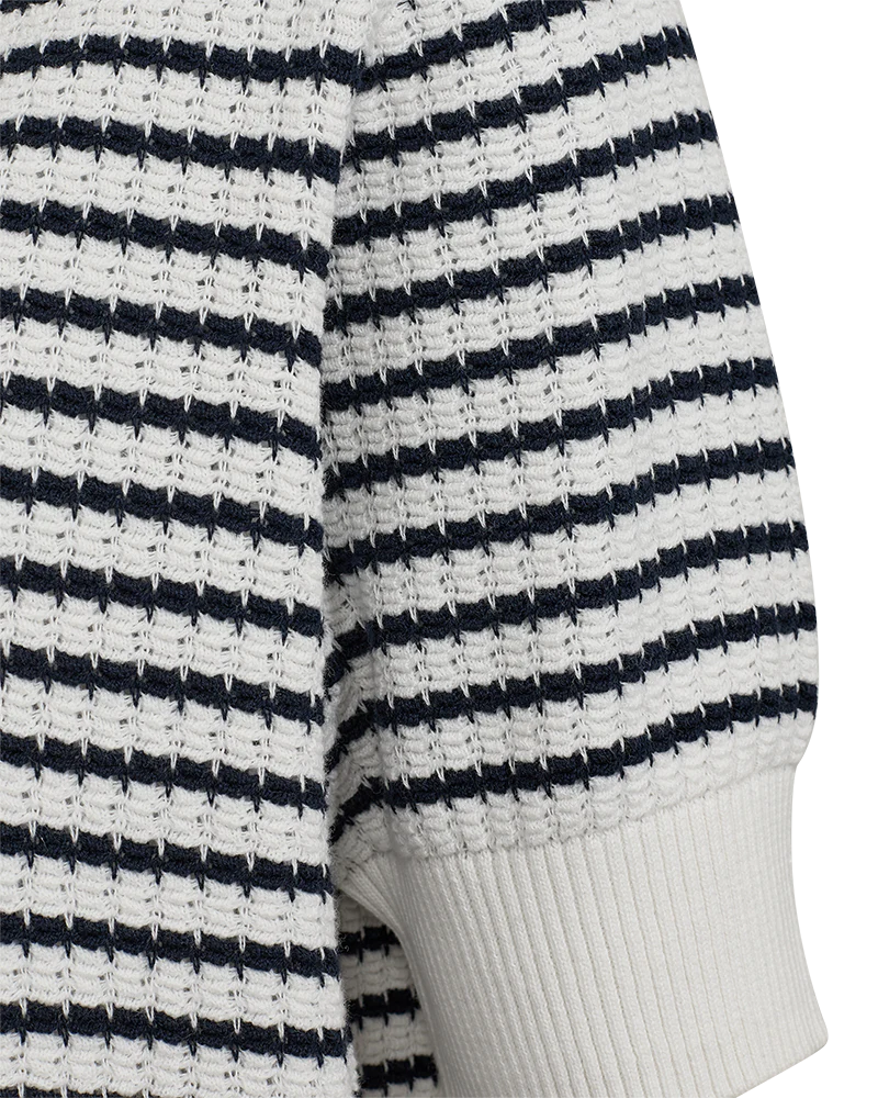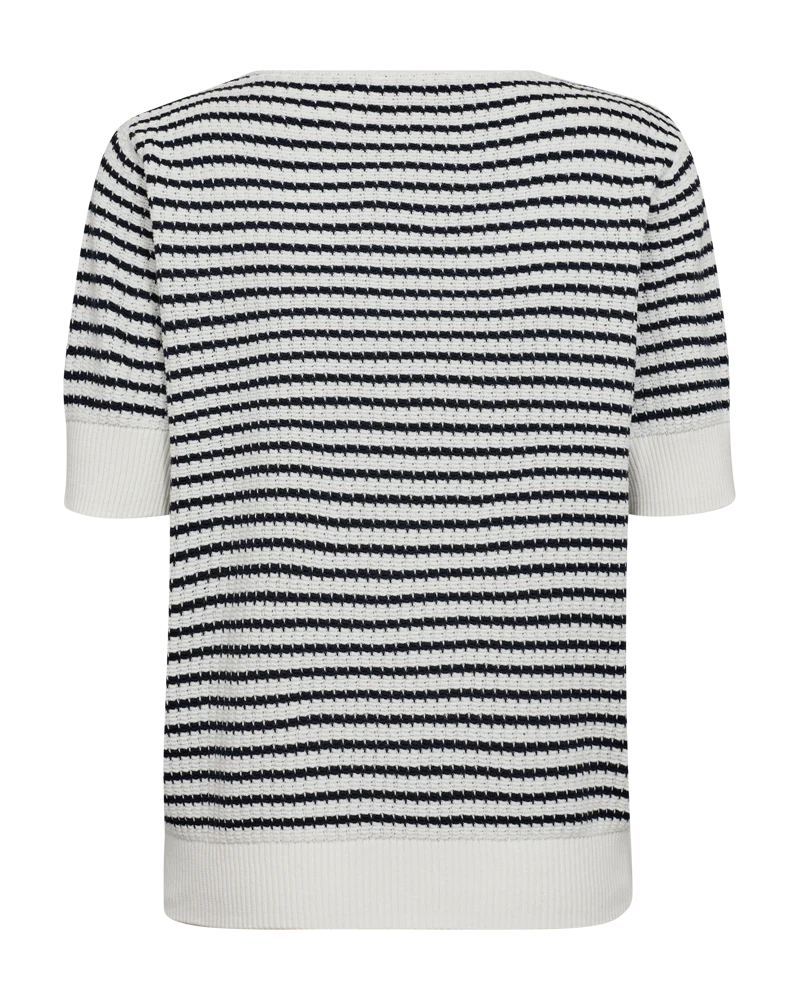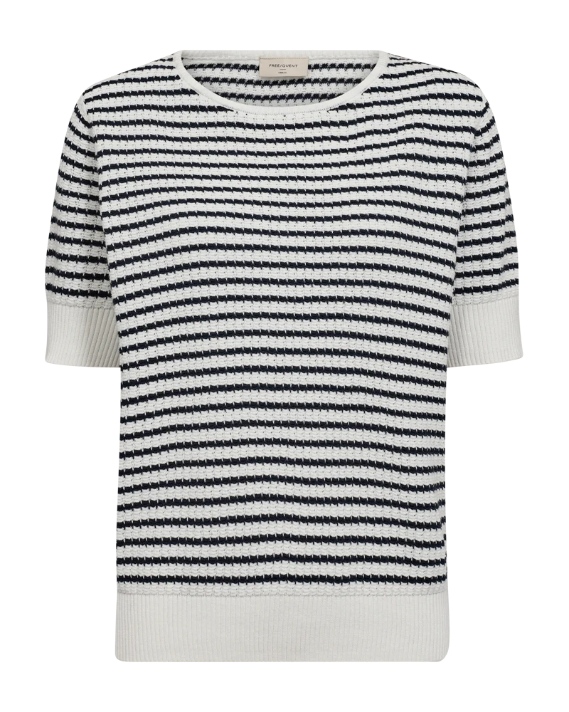 Pullover fra Freequent i en blød, finstrikket kvalitet med strukturmønster og striber. Pulloveren er enkel i modellen med korte pufærmer, en rund halsudskæring, brede ribkanter samt en elegant, løs pasform. Korte pufærmer Rund halsudskæring Løs pasform Ribkanter Strukturmønster Stribet