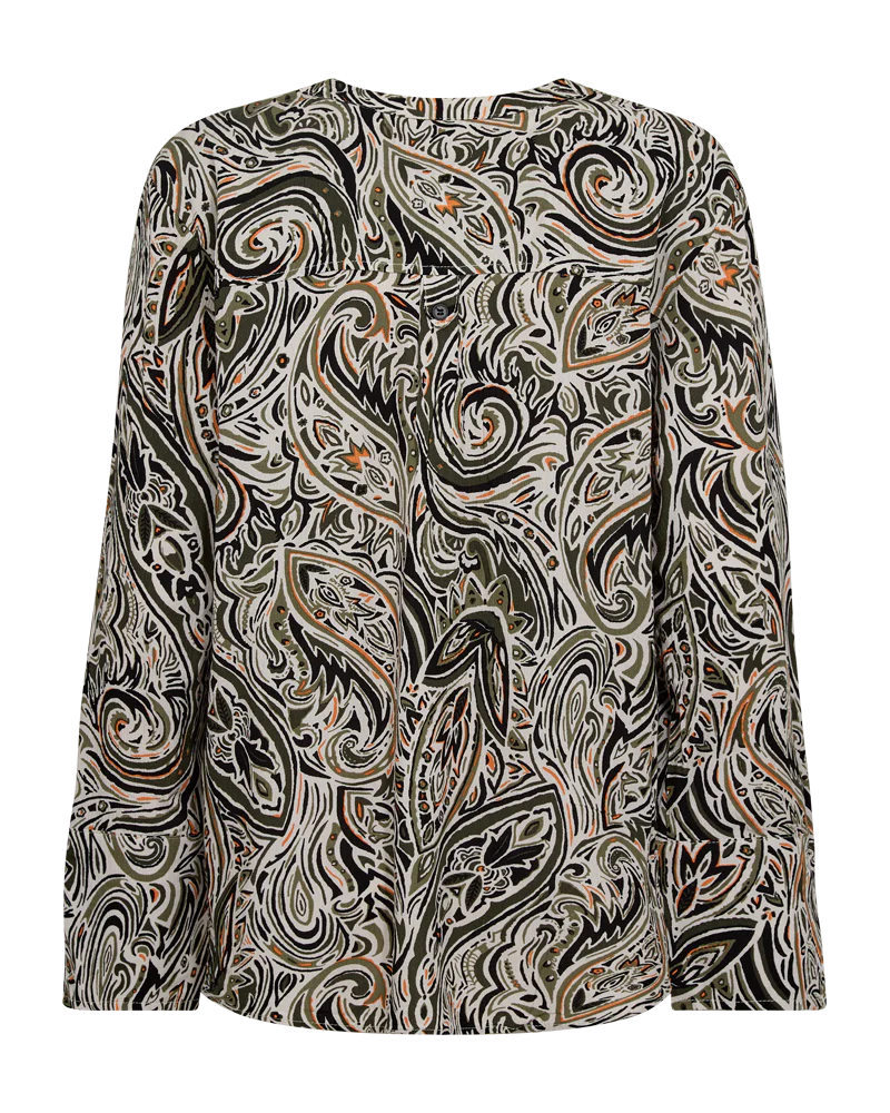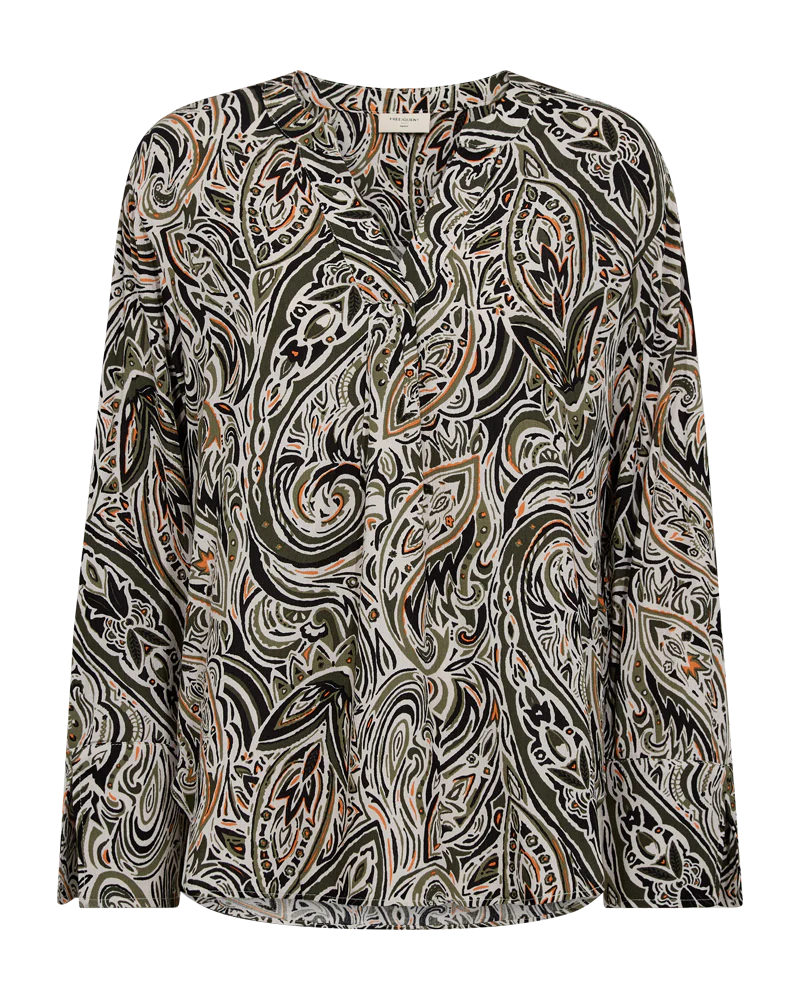 Bluse fra Freequent i en blød kvalitet med et flot print. Blusen har en elegant, løs pasform, V-udskæring med læg samt lange ærmer med slids i cuffen. Lange ærmer V-udskæring Løs pasform Print Slidser