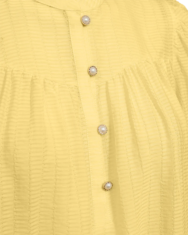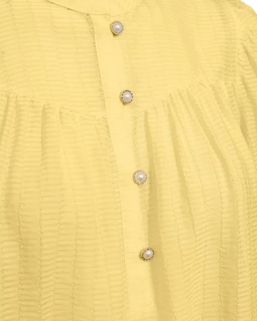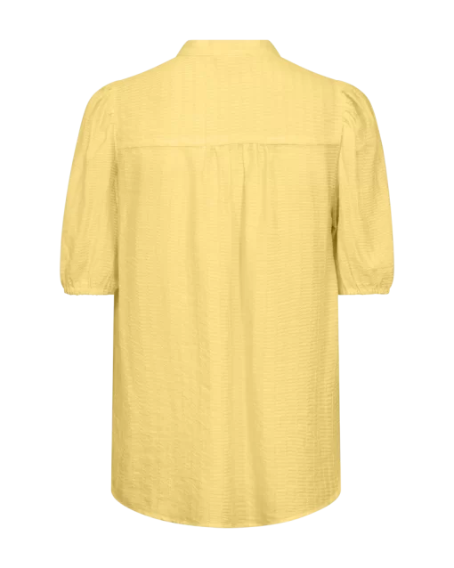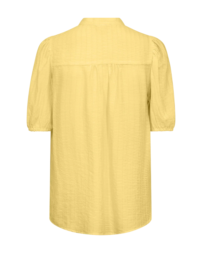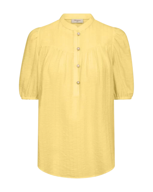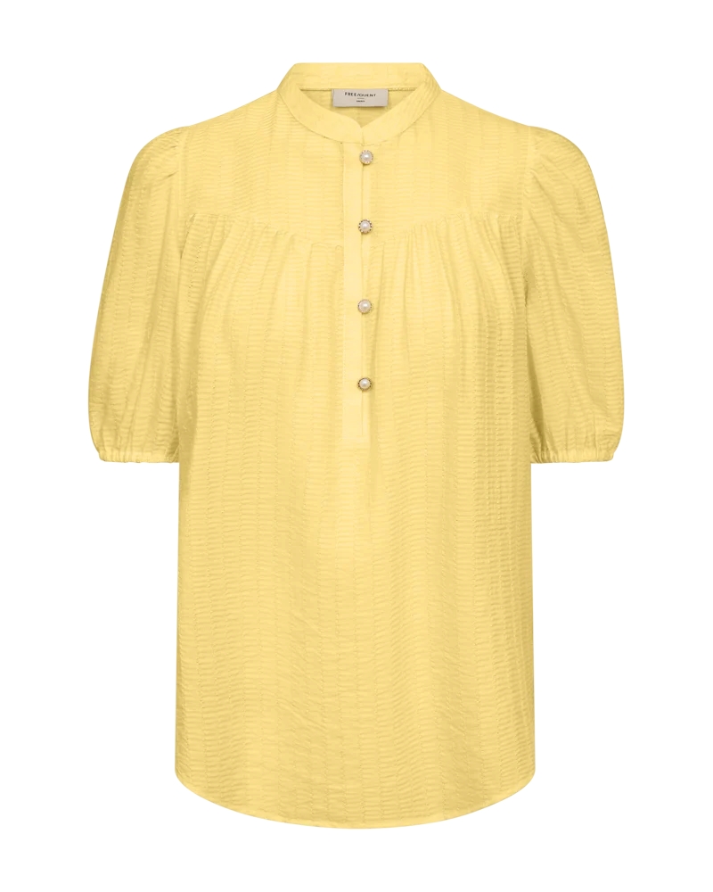 Bluse fra Freequent i en let kvalitet med strukturmønster. Blusen er enkel i modellen med korte ballonærmer med elastik cuff, en elegant, løs pasform samt de smukkeste knapper med perlemorseffekt på fronten. Korte ballonærmer Knaplukning Løs pasform Strukturmønster