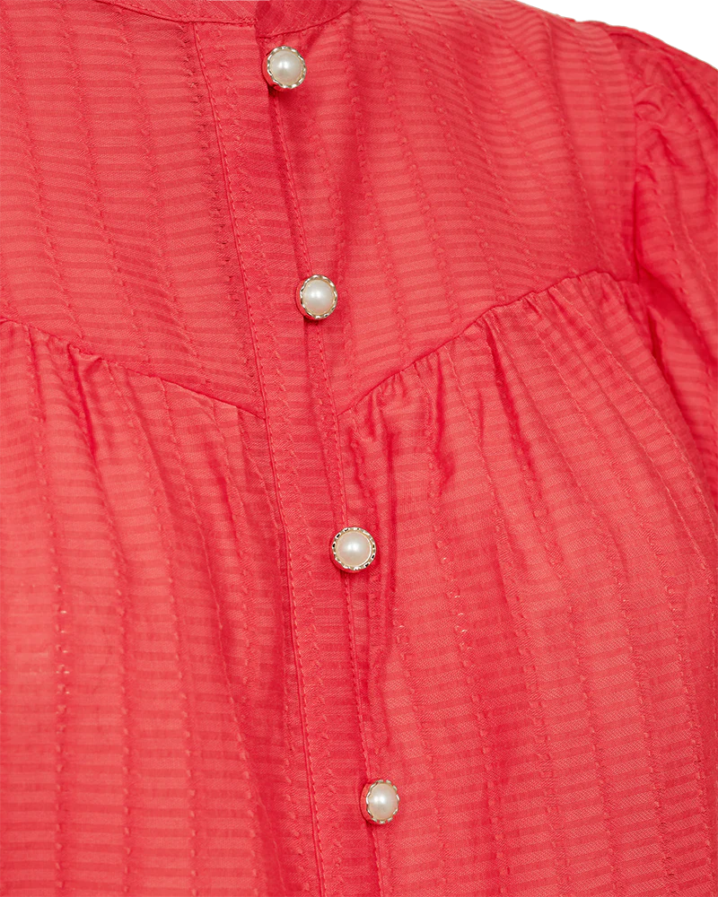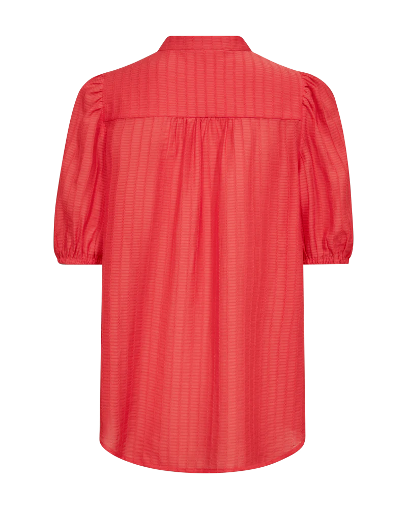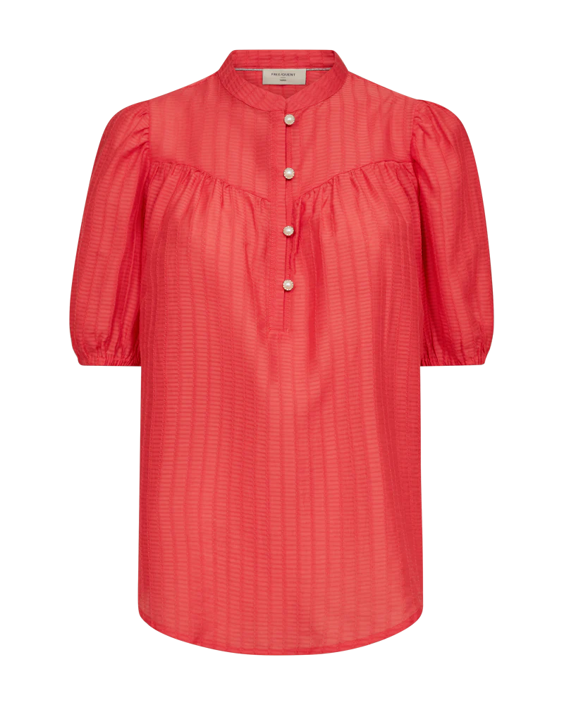 Bluse fra Freequent i en let kvalitet med strukturmønster. Blusen er enkel i modellen med korte ballonærmer med elastik cuff, en elegant, løs pasform samt de smukkeste knapper med perlemorseffekt på fronten. Korte ballonærmer Knaplukning Løs pasform Strukturmønster