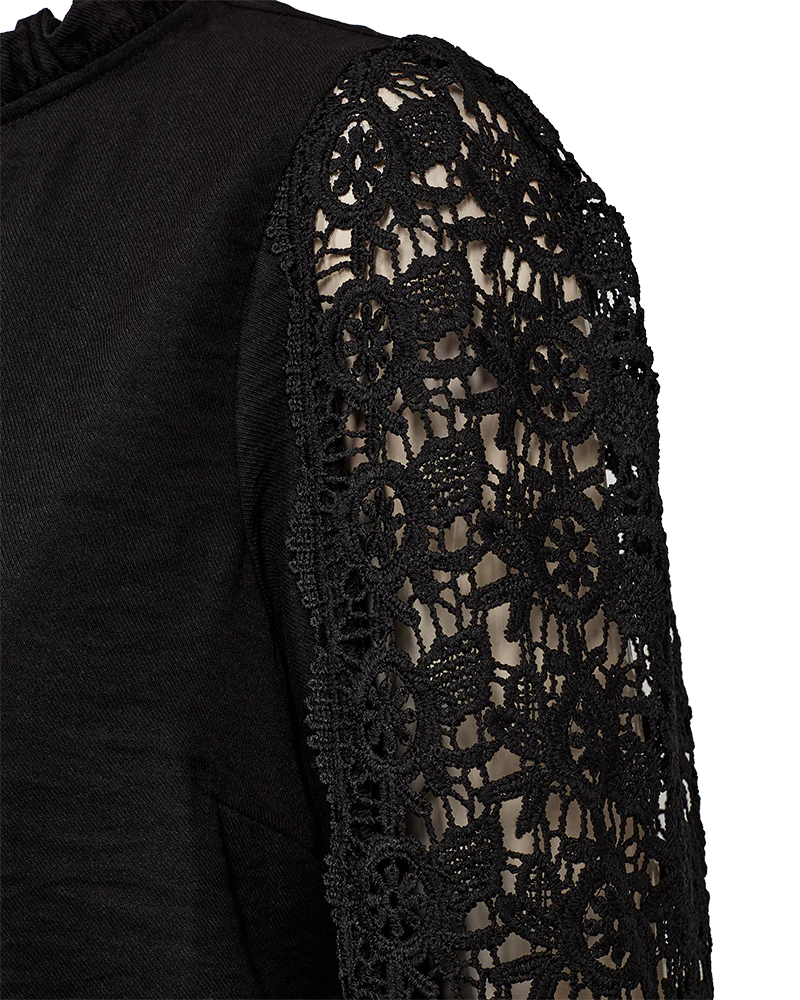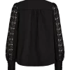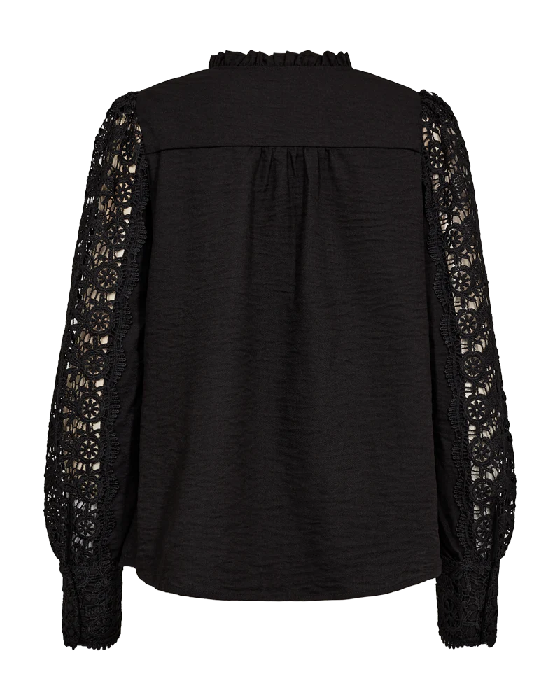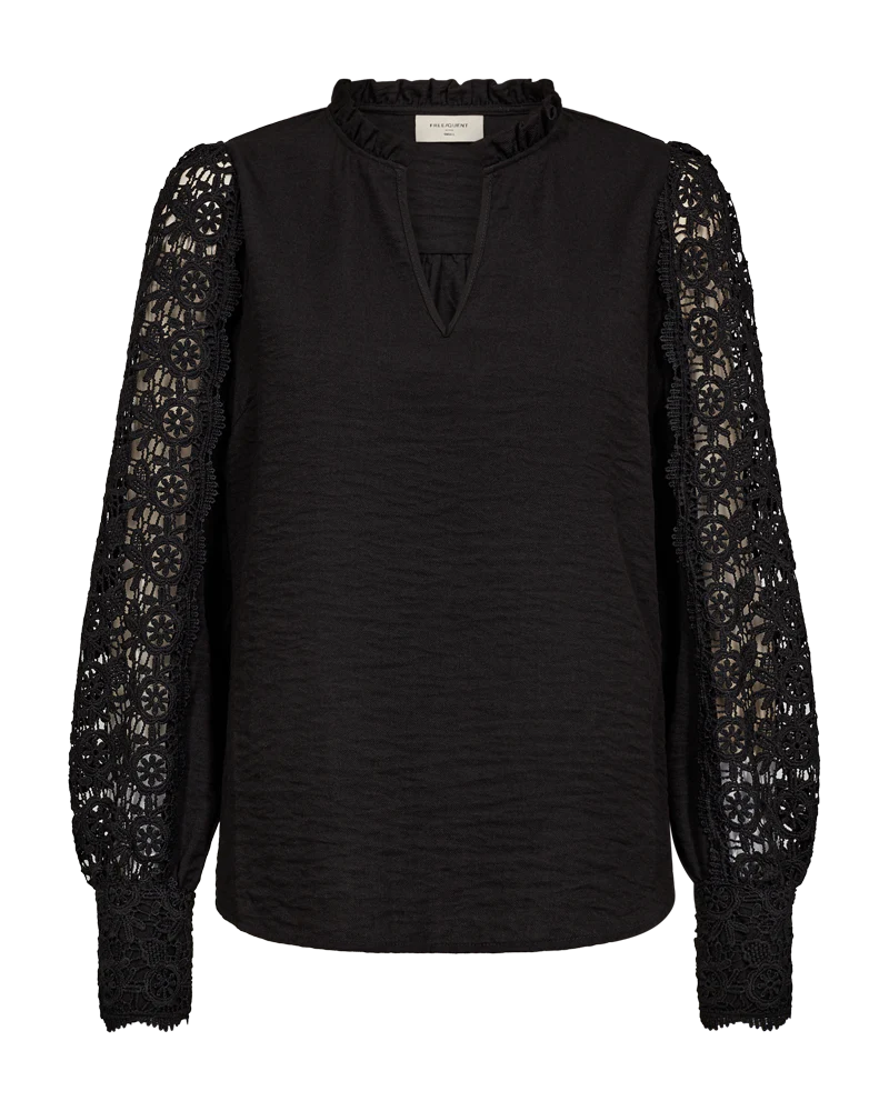 Bluse fra Freequent i en blød kvalitet. Blusen har lange ballonærmer med manchetter og de fineste blonder, V-udskæring, fine læg på ryggen samt en elegant flæsekrave. Detaljer, der tilsammen giver blusen et feminint udtryk. Lange ballonærmer V-udskæring Flæsekrave Læg på ryggen Blonder Længde fra skulder i str. S er 64
