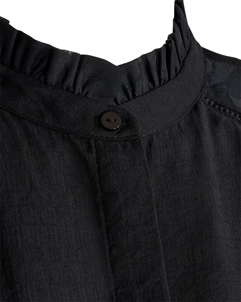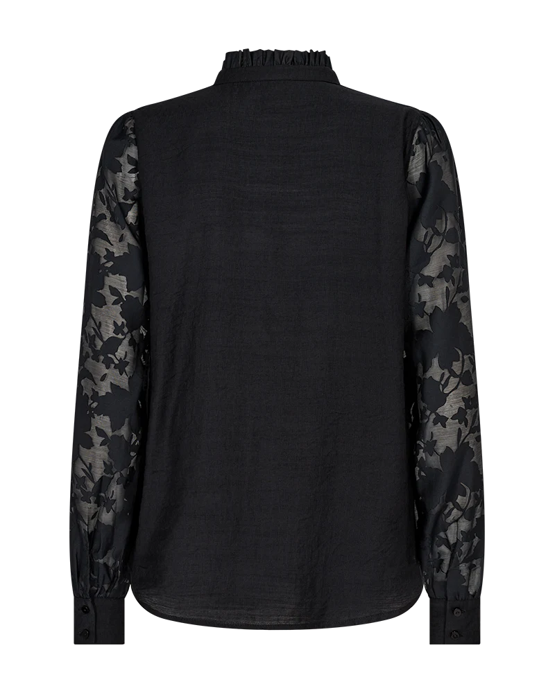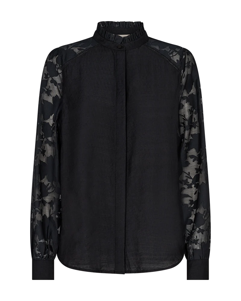 Skjorte i en let kvalitet med en smuk struktur. Skjorten er enkel i modellen med en løs pasform, en skjult knaplukning på fronten, en høj hals med flæsedetaljer samt lange ærmer med transparente og blomstrede detaljer. Struktur Løs pasform Skjult knaplukning Høj hals Transparente ærmer Blomstrede detaljer