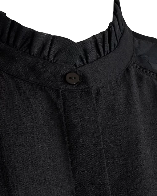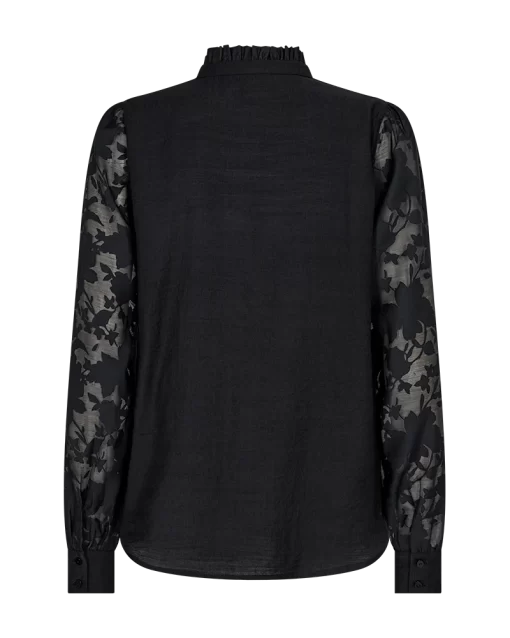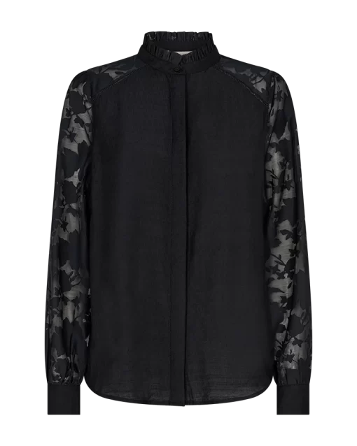 Skjorte i en let kvalitet med en smuk struktur. Skjorten er enkel i modellen med en løs pasform, en skjult knaplukning på fronten, en høj hals med flæsedetaljer samt lange ærmer med transparente og blomstrede detaljer. Struktur Løs pasform Skjult knaplukning Høj hals Transparente ærmer Blomstrede detaljer