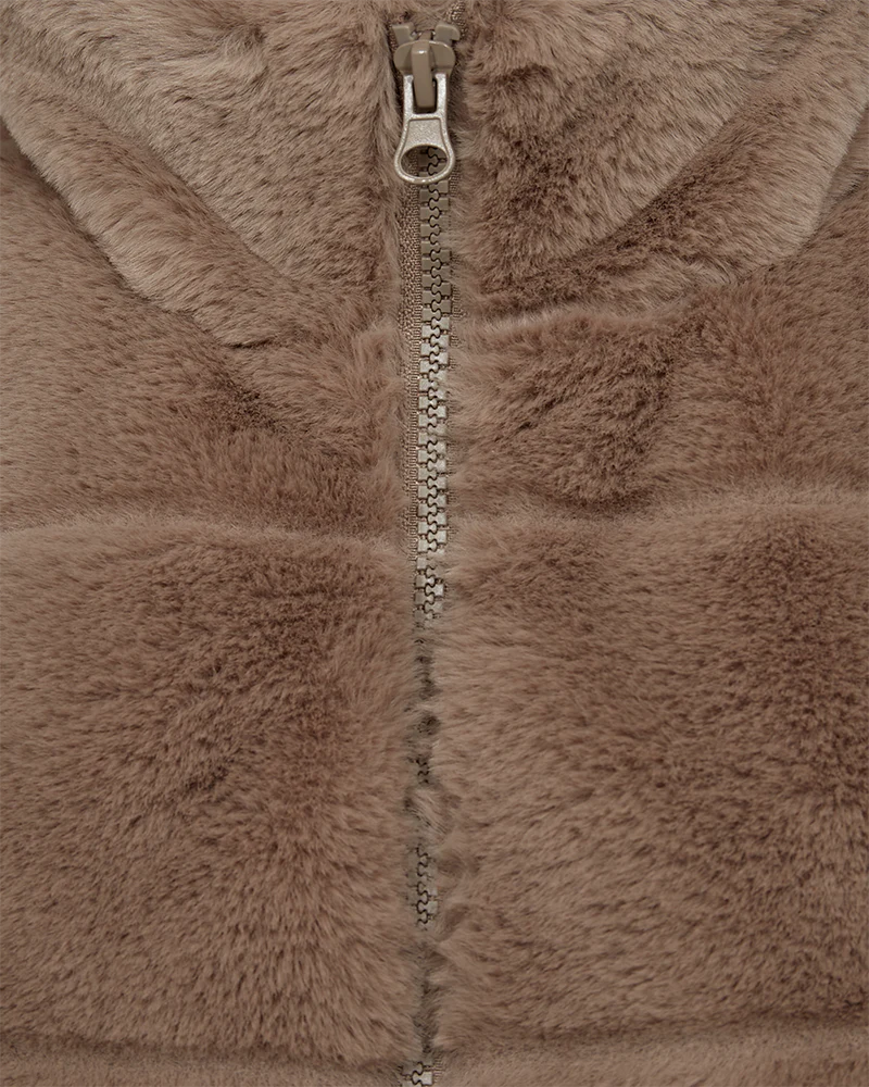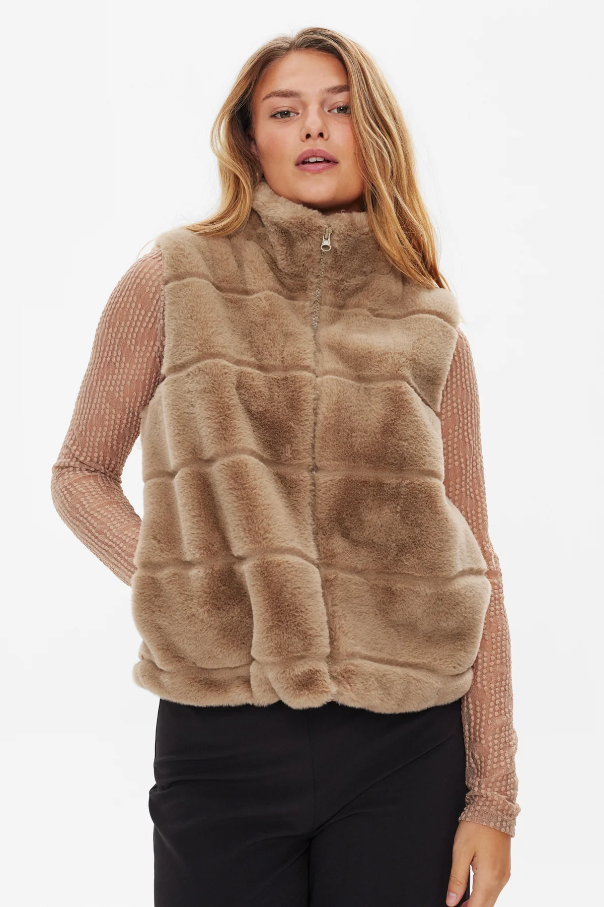 Vest fra Freequent i den smukkeste 'faux fur'-kvalitet. Vesten er enkel i modellen med lynlåslukning på fronten, en lige pasform samt en høj kravekant. Modellen bruger størrelse S og er 176 cm høj.