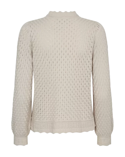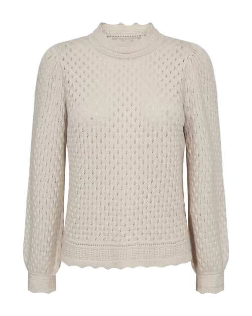 Pullover fra Freequent i en blød kvalitet med det fineste mønster. Derudover har pulloveren en løs pasform samt blondekanter i den runde halsudskæring, de lange pufærmer og i bundkanten. En detalje, der fremhæver det feminine udtryk. Lange pufærmer Rund halsudskæring Løs pasform Blondekanter Mønstret Længde fra skulder
