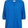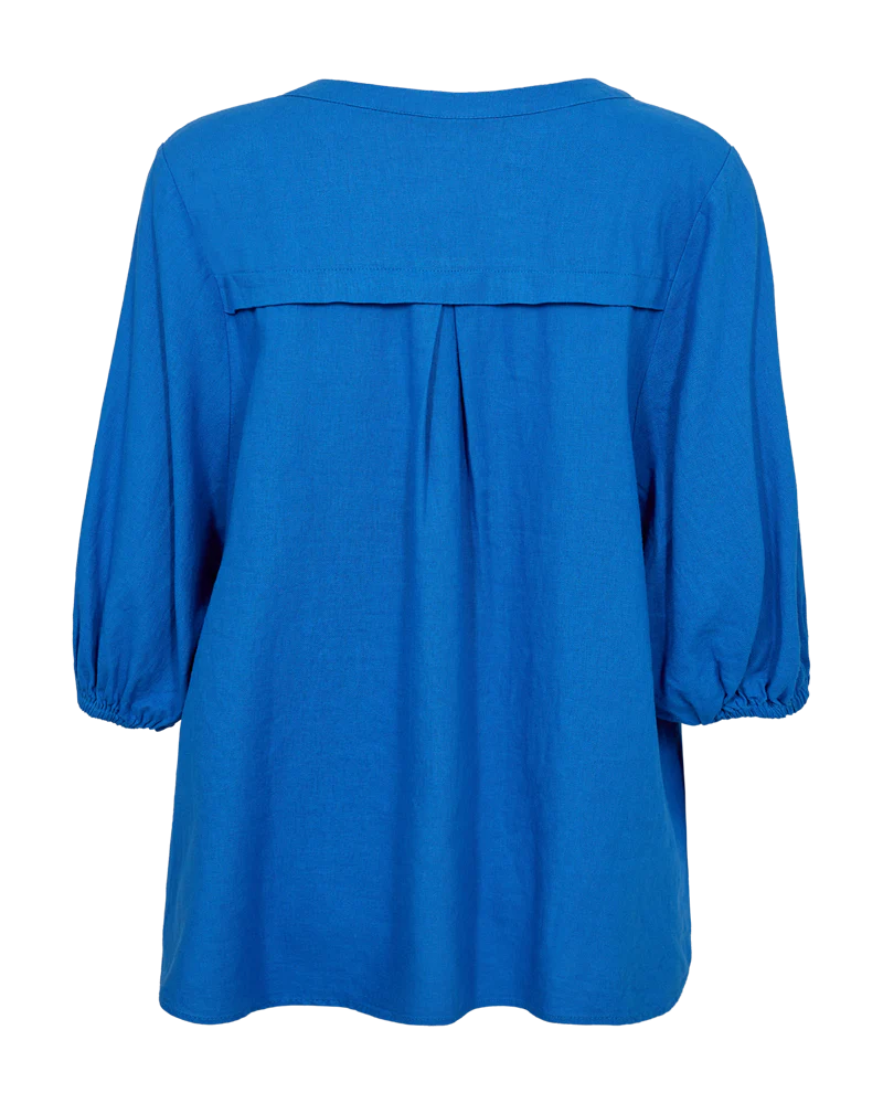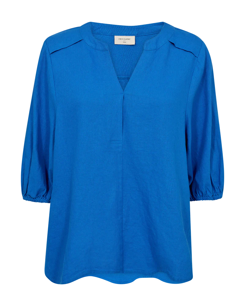 Bluse fra Freequent i en let hørkvalitet. Blusen er enkel i modellen med halværmer med elastik cuff, V-udskæring, en lille kinakrave, læg ved skuldrene samt en løs pasform. Korte ærmer V-udskæring Kinakrave Læg ved skuldrene Løs pasform Modellen bruger størrelse S og er 176 cm høj.