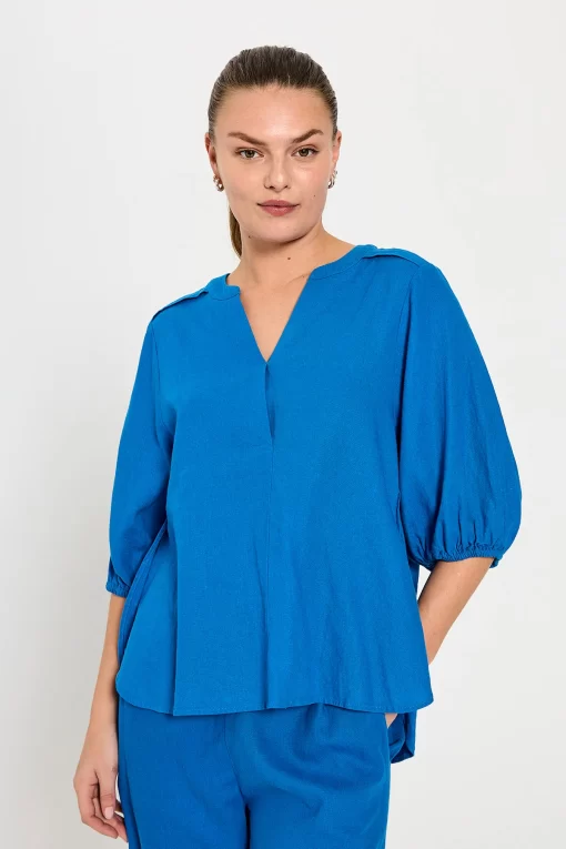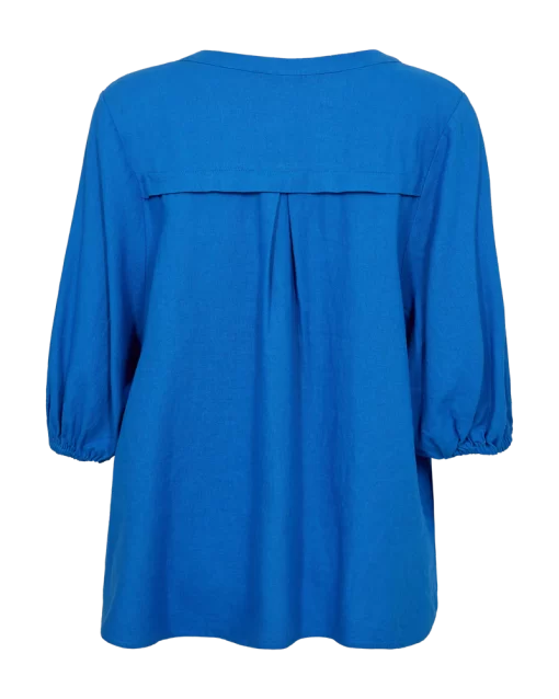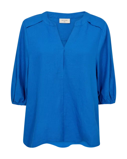 Bluse fra Freequent i en let hørkvalitet. Blusen er enkel i modellen med halværmer med elastik cuff, V-udskæring, en lille kinakrave, læg ved skuldrene samt en løs pasform. Korte ærmer V-udskæring Kinakrave Læg ved skuldrene Løs pasform Modellen bruger størrelse S og er 176 cm høj.