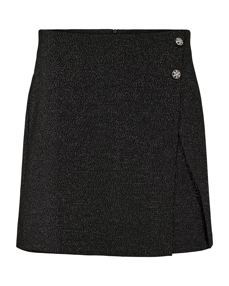 Nederdel fra Freequent i en blød lurex-kvalitet med en smuk, metallisk overflade. Derudover er nederdelen enkel i modellen med en slids på fronten, shorts, lynlåslukning bagpå, en høj talje samt dekorative knapper med små similisten. Høj talje Lynlåslukning bagpå Slids på fronten Dekorative knapper Shorts Metallisk ove