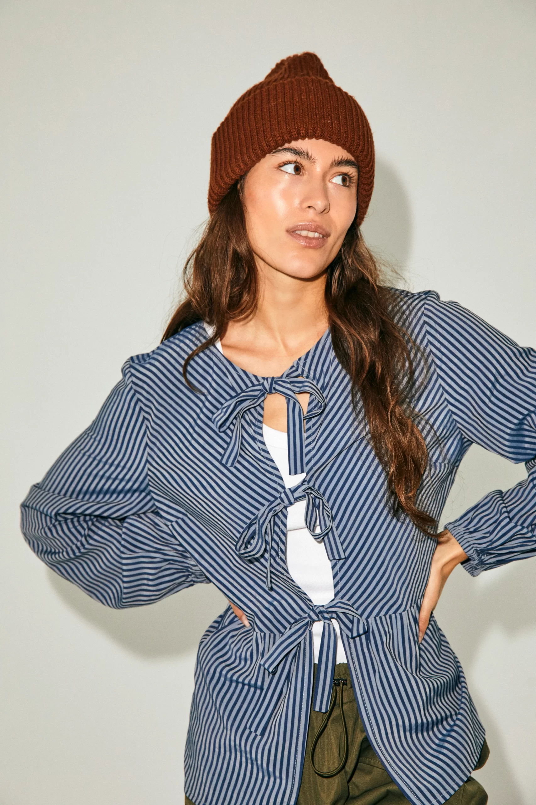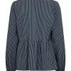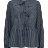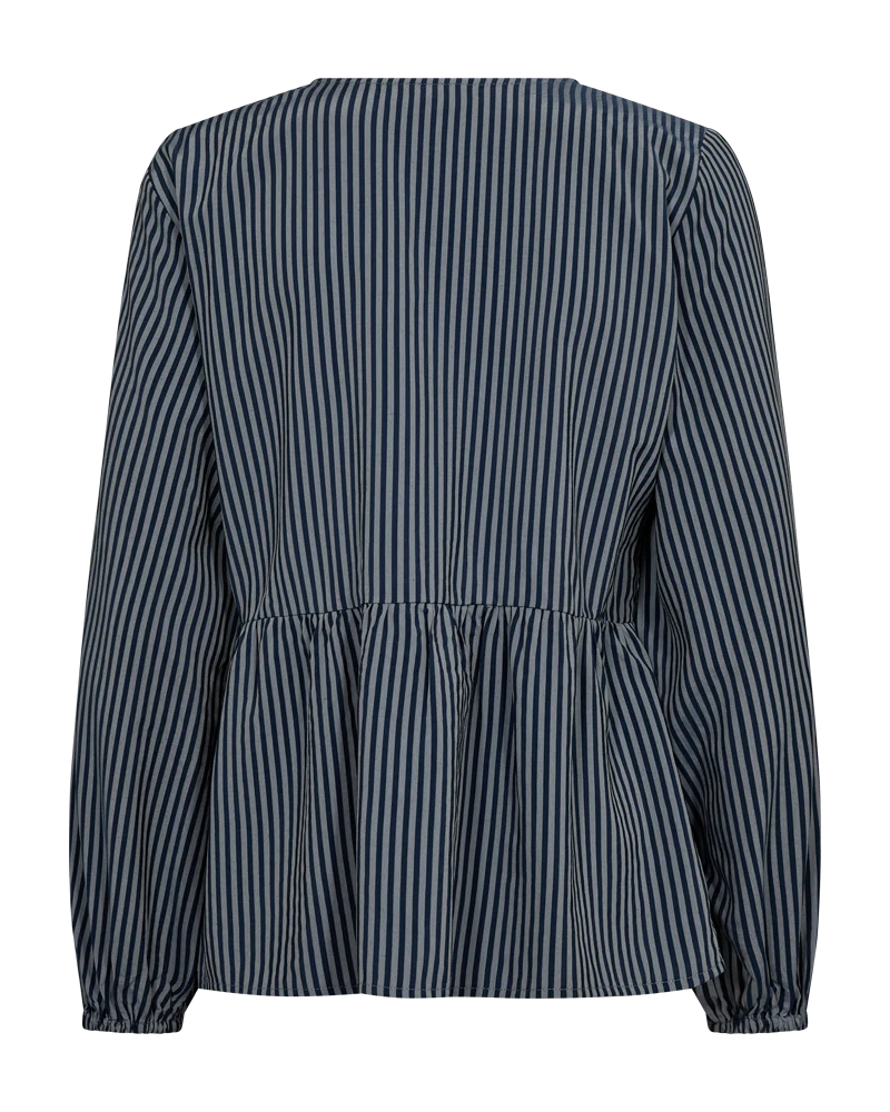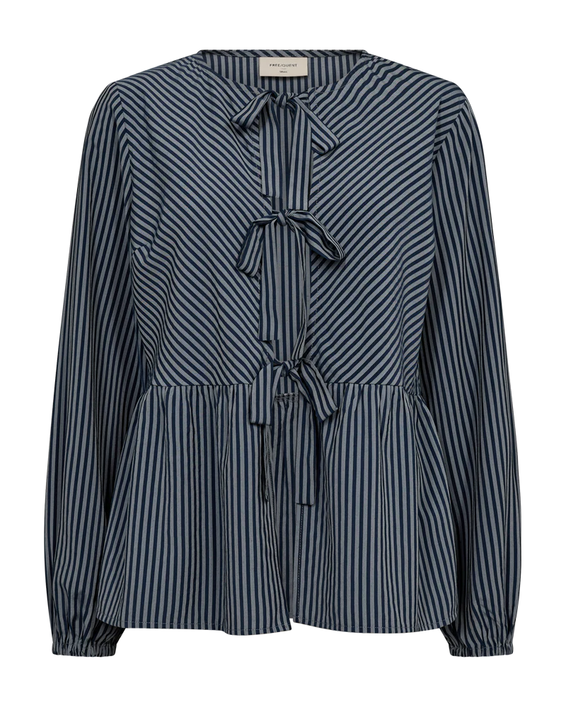 Bluse fra Freequent i en blød kvalitet med et stribet print. Blusen er enkel i modellen med lange ballonærmer, en åben front med bindebånd samt en bred volant, der giver en let peplum-effekt. Lange ballonærmer Åben front Bindebånd Peplum-effekt Stribet