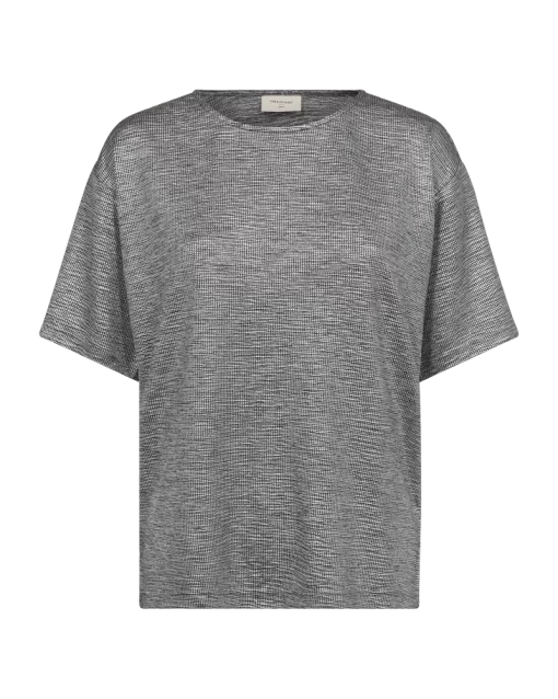 T-shirt fra Freequent i en smuk kvalitet med metallisk folie printet på. Derudover er T-shirten enkel i modellen med korte ærmer, en rund halsudskæring samt drop shoulders, der understreger den løse pasform. Korte ærmer Rund halsudskæring Løs pasform Metallisk folieprint Drop shoulders Længde fra skulder i str. S er 60