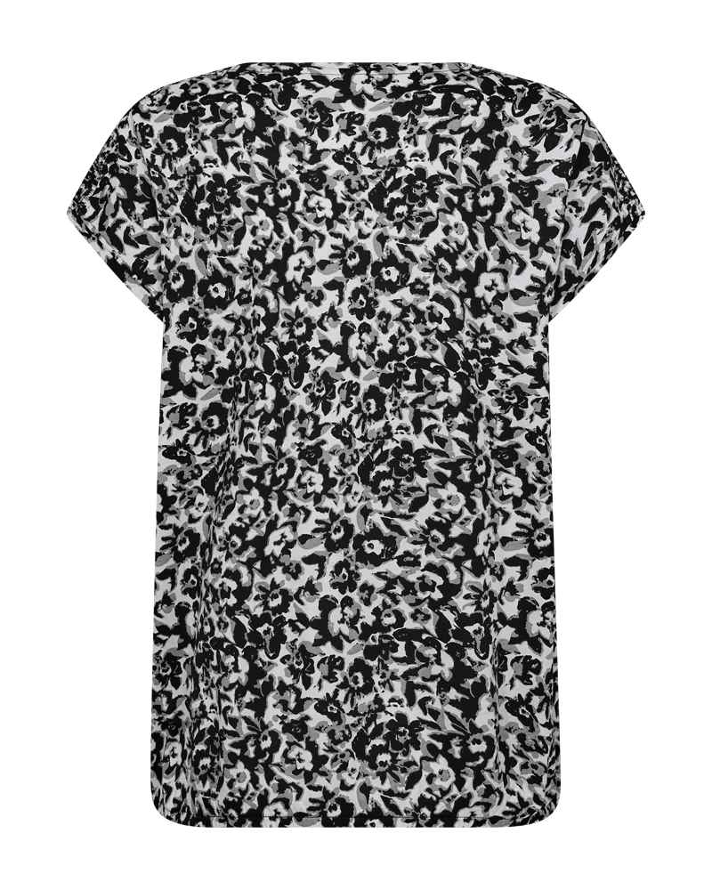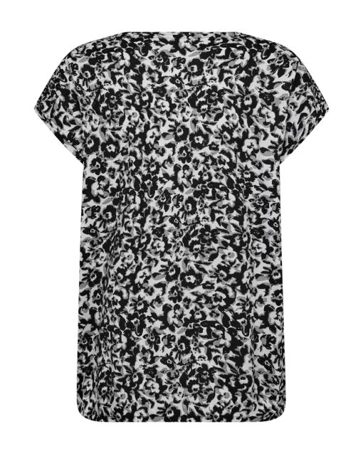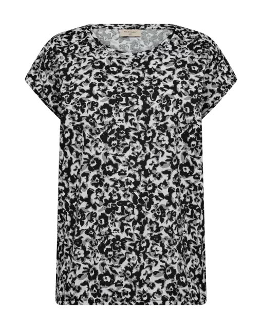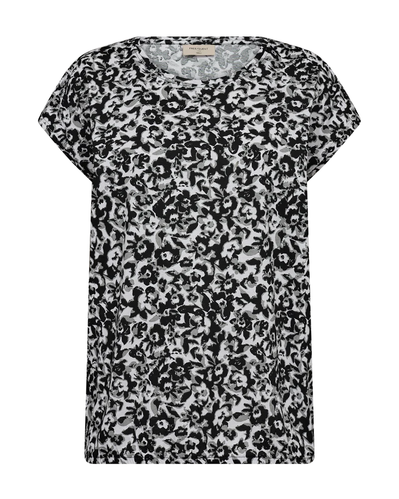 T-shirt fra Freequent i en blød kvalitet med et blomstret print. T-shirten er enkel i modellen med korte ærmer, en rund halsudskæring, ribkanter samt en smal elastikkant i bunden, der understreger den løse pasform. Korte ærmer Rund halsudskæring Løs pasform Ribkanter Elastikkant Blomstret