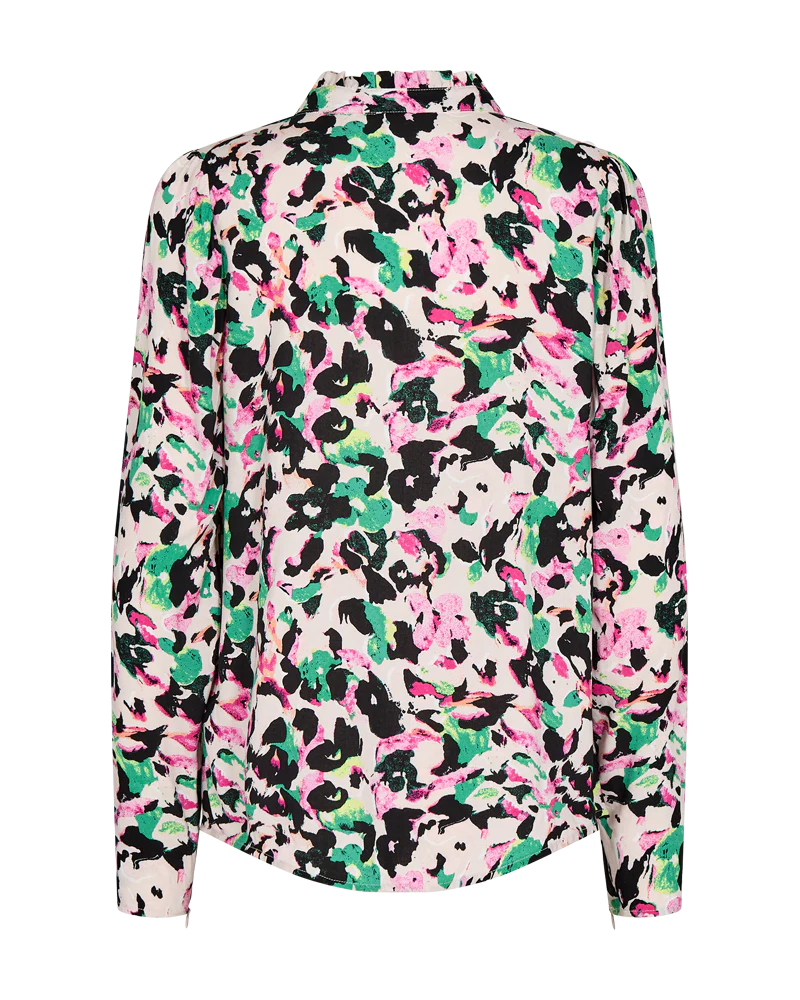 Bluse i en blød kvalitet med et flot print. Blusen er enkel i modellen med lange ærmer, en kravekant med flæser, knapper på den ene skulder samt en løs pasform. En skøn bluse i en lækker kvalitet. Lange ærmer Krave med flæser Knaplukning Løs pasform Print